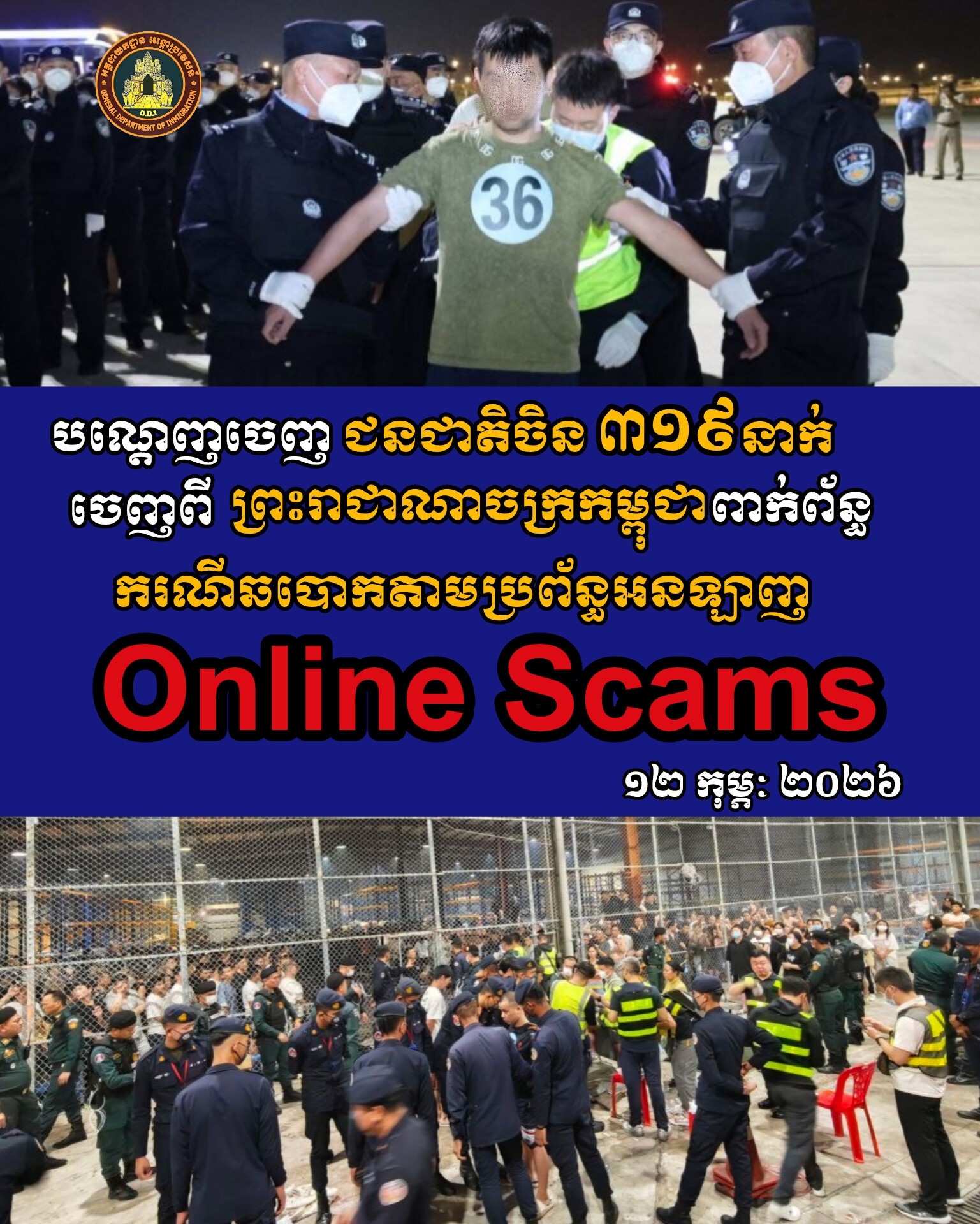 ព័ត៌មានជាតិ ជនជាតិចិនជាង ៣០០នាក់ទៀត ត្រូវបណ្ដេញចេញពីកម្ពុជា ពាក់ព័ន្ធករណីឆបោកតាមប្រព័ន្ធអនឡាញ នៅយប់ថ្ងៃទី១១ ខែកុម្ភៈ ឆ... សុផុនខែកុម្ភៈ 12, 2026