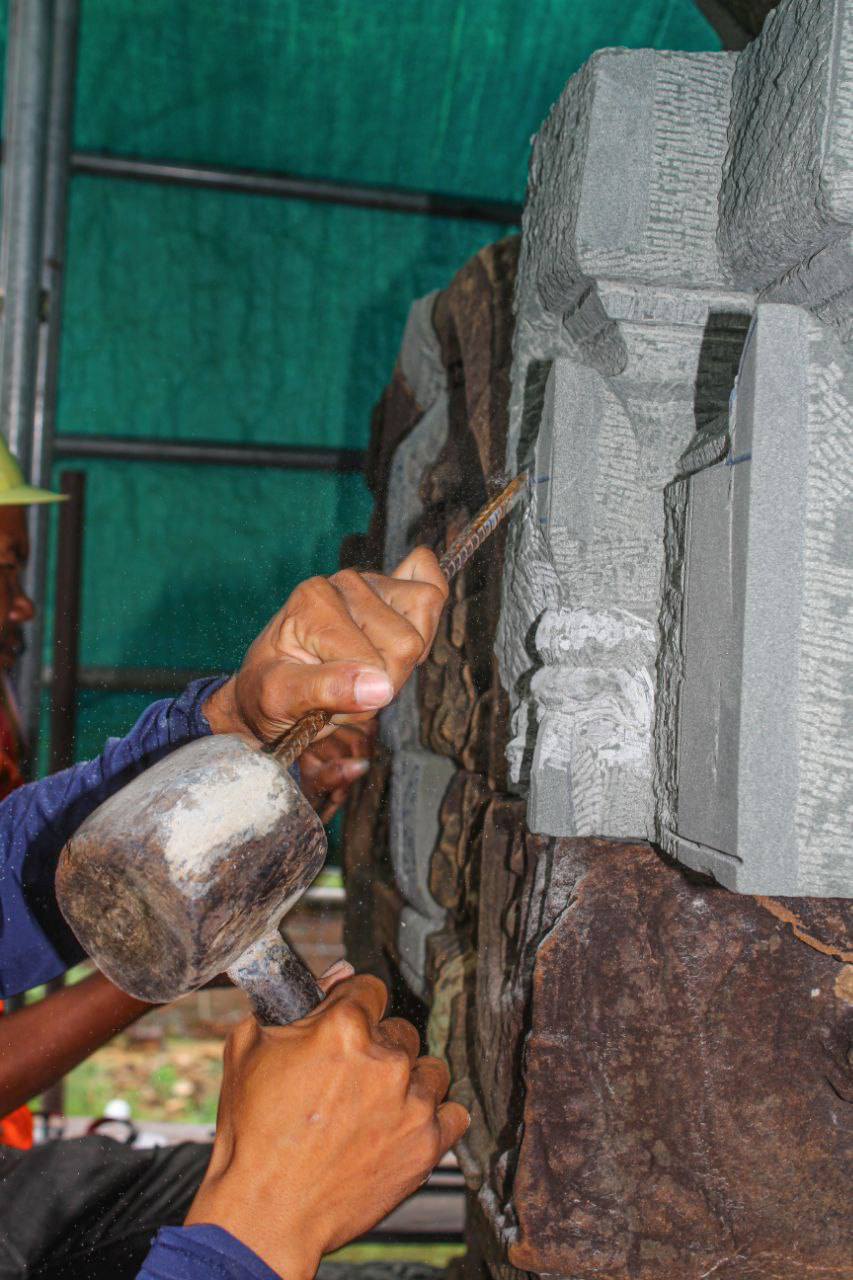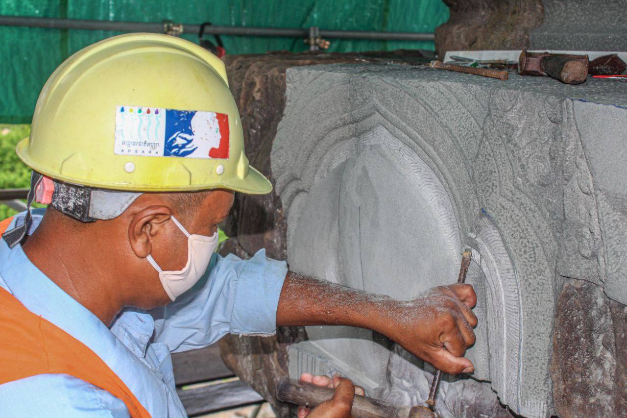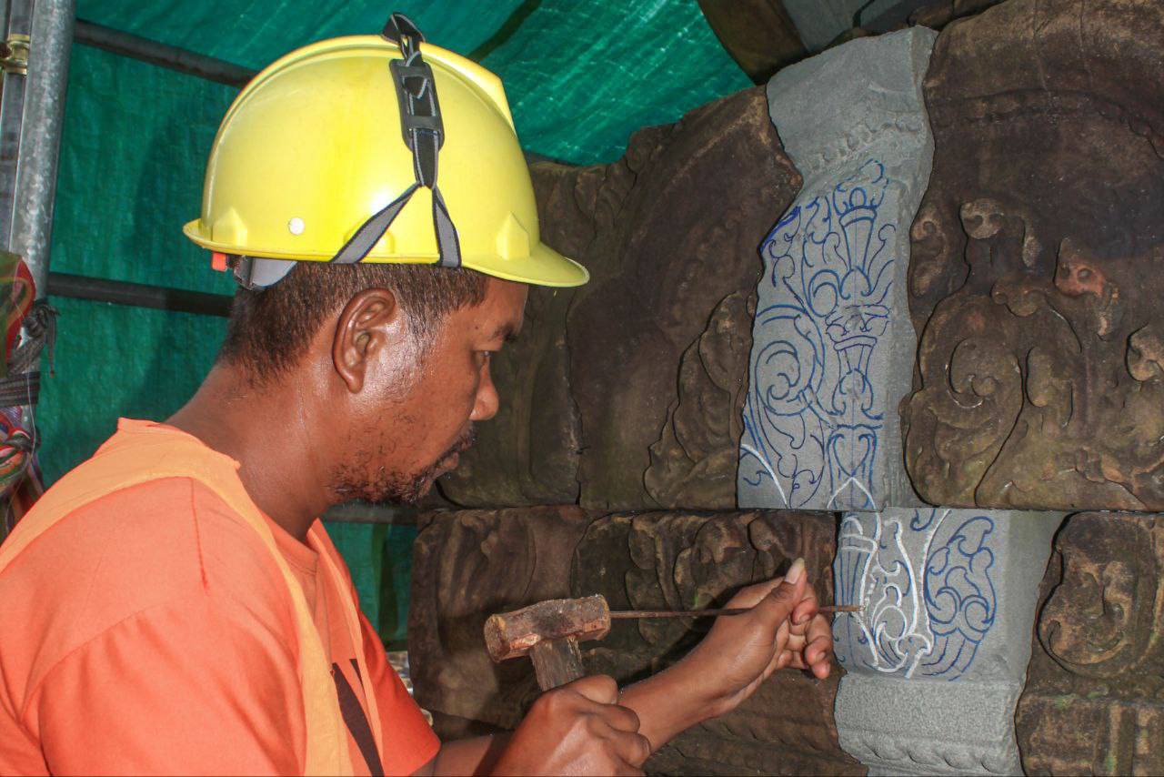 ជាងចម្លាក់នៅប្រាសាទមេបុណ្យខាងលិច ឆ្លាក់ក្បាច់តាមទ្រង់ទ្រាយដើម ទុកជាកេរដំណែលរយឆ្នាំបន្តទៀត
