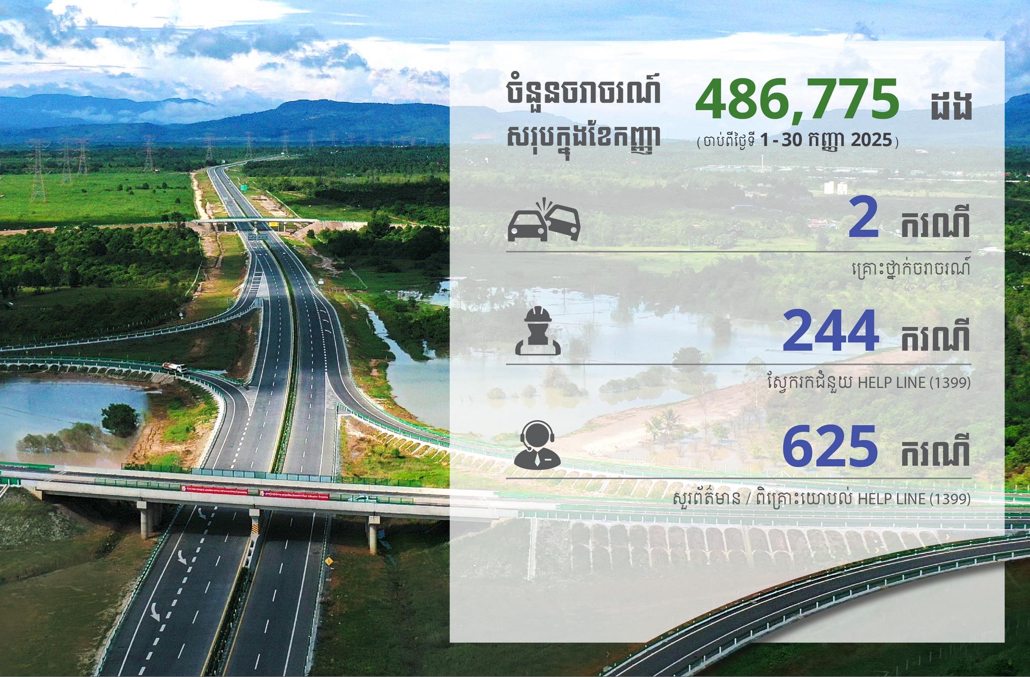 យោងតាមរបាយការណ៍លំហូរចរាចរណ៍ប្រចាំខែ គិតចាប់ពីថ្ងៃទី១-៣០ ខែកញ្ញា ឆ្នាំ២០២៥ ចរាចរណ៍លើផ្លូវល្បឿនលឿនសរុបមានចំនួន ៤៨៦,៧៧៥ ដង។ ក្នុងនោះដែរ ក្នុងរយៈពេលភ្ជុំបិណ្ឌ៣ថ្ងៃ (ថ្ងៃទី២១-២៣ ខែកញ្ញា ឆ្នាំ២០២៥) ចរាចរណ៍សរុបមានចំនួន ៦២,២៩១ ដង។