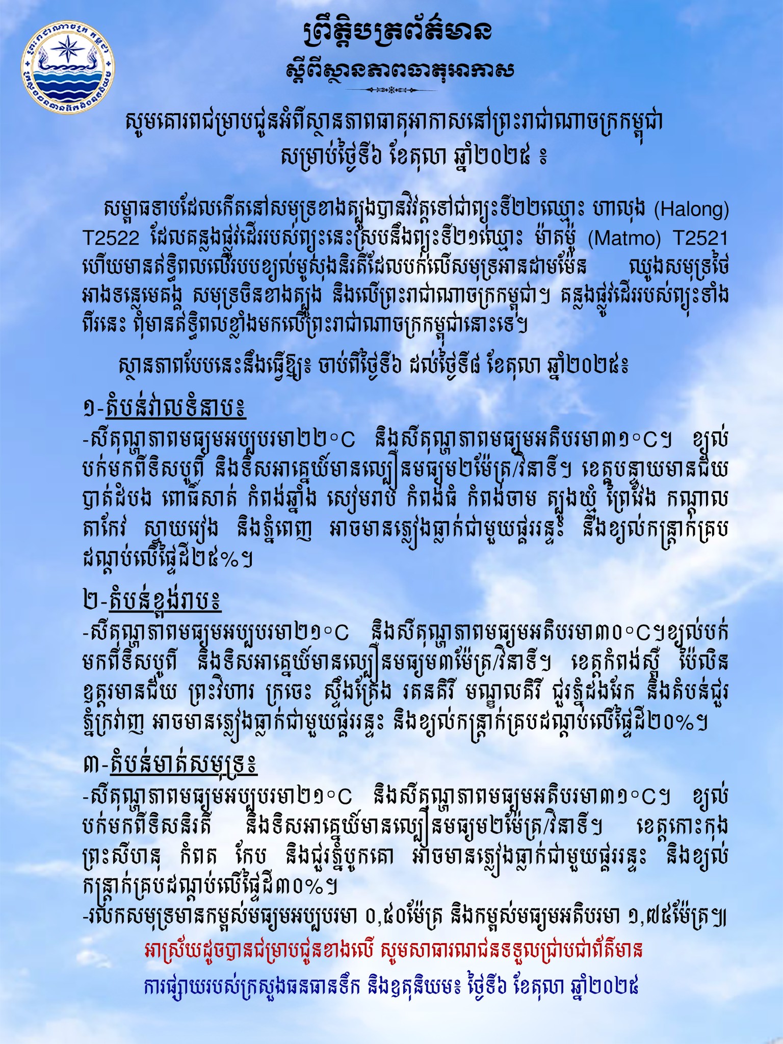ក្រសួងធនធានទឹក និងឧត្តុនិយម បានបញ្ជាក់ថា សម្ពាធទាបដែលកើតនៅសមុទ្រខាងត្បូង បានវិវត្តទៅជាព្យុះទី២២ឈ្មោះ ហាលុង (Halong) T2522 ដែលគន្លងផ្លូវដើររបស់ព្យុះនេះ ស្របនឹងព្យុះទី២១ឈ្មោះ ម៉ាតម៉ូ (Matmo) T2521 ហើយមានឥទ្ធិពលលើរបបខ្យល់មូសុងនិរតីដែលបក់លើសមុទ្រអ៊ានដាមម៉ែន ឈូងសមុទ្រថៃ អាងទន្លេមេគង្គ សមុទ្រចិនខាងត្បូង និងលើព្រះរាជាណាចក្រកម្ពុជា។ គន្លងផ្លូវដើររបស់ព្យុះទាំងពីរនេះ ពុំមានឥទ្ធិពលខ្លាំងមកលើព្រះរាជាណាចក្រកម្ពុជានោះទេ។