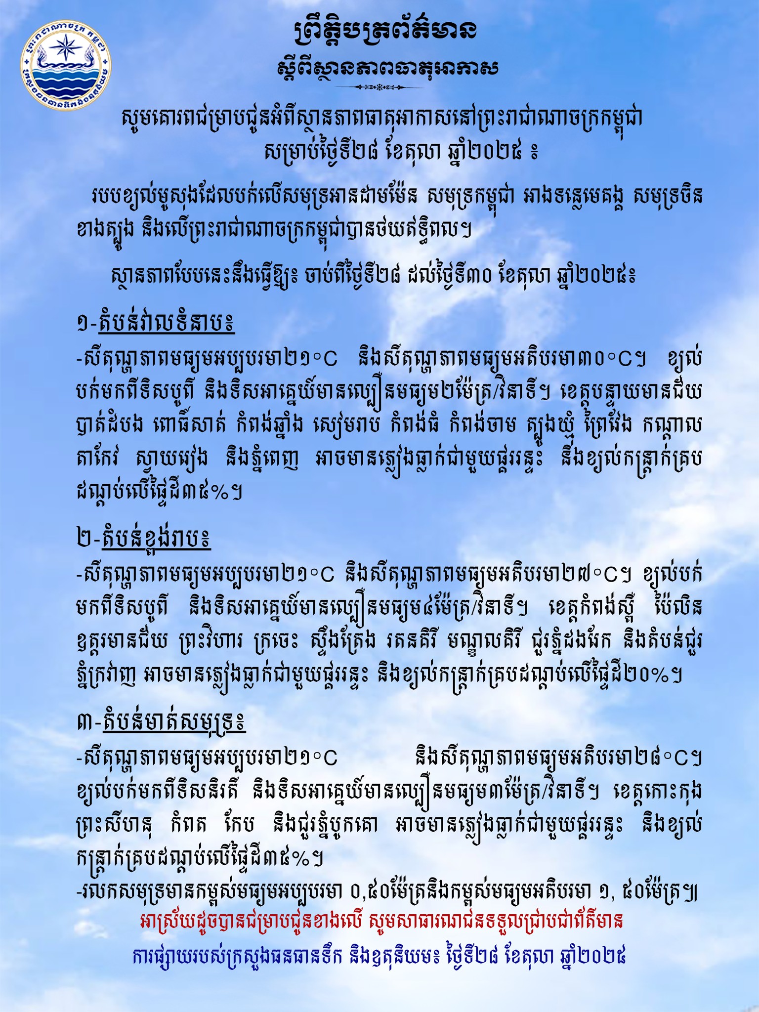 ក្រសួងធនធានទឹក និងឧតុនិយម បានបញ្ជាក់ថា នៅថ្ងៃទី២៨ ដល់៣០ ខែតុលានេះ តំបន់សម្ពាធទាប នឹងគ្រប់ដណ្តបលើកម្ពុជាដែលអាចបណ្តាលឱ្យមានភ្លៀងធ្លាក់ច្រើន នៅខេត្តកោះកុង ព្រះសីហនុ កំពត កំពង់ស្ពឺ ពោធិ៍សាត់ កំពង់ឆ្នាំង កំពង់ធំ ស្ទឹងត្រែង ក្រចេះ រតនគិរី មណ្ឌលគិរី ត្បូងឃ្មុំ កំពង់ចាម ព្រៃវែង តាកែវ ស្វាយរៀង និងរាជធានីភ្នំពេញ។ ក្រសួងសូមឲ្យប្រជាពលរដ្ឋ មានការប្រុងប្រយ័ត្នខ្ពស់៕