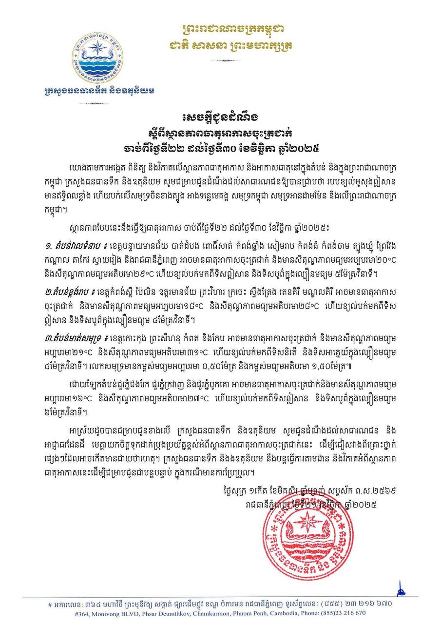 ក្រសួងធនធានទឹក និងឧតុនិយម នៅថ្ងៃទី២១ ខែវិច្ឆិកា ឆ្នាំ២០២៥នេះ ចេញសេចក្តីជូនដំណឹងពីស្ថានភាពធាតុអាកាសចុះត្រជាក់ ចាប់ពីថ្ងៃទី២២ ដល់ថ្ងៃទី៣០ ខែវិច្ឆិកា ឆ្នាំ២០២៥។