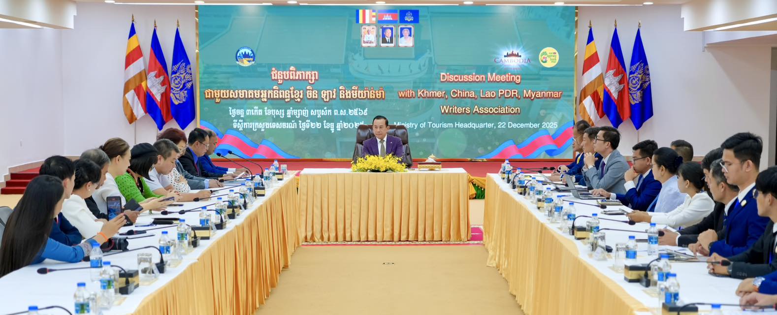ឯកឧត្តម ហួត ហាក់ រដ្ឋមន្ត្រីក្រសួងទេសចរណ៍ រួមជាមួយថ្នាក់ដឹកនាំក្រសួង នាទីស្តីការក្រសួងទេសចរណ៍ ថ្ងៃទី២២ ខែធ្នូ ឆ្នាំ២០២៥ បានអញ្ជើញជាអធិបតីក្នុងជំនួបពិភាក្សាជាមួយសមាគមអ្នកនិពន្ធខ្មែរ ចិន ឡាវ និងមីយ៉ាន់ម៉ា ដែលដឹកនាំដោយ ឯកឧត្តម ព្រឿង ប្រណីត ប្រធានសមាគមអ្នកនិពន្ធខ្មែរ, លោកស្រី JIANG JINLU អនុប្រធានសមាគមអ្នកនិពន្ធចិន, លោក THONBAY PHOTHISANE ប្រធានសមាគមអ្នកនិពន្ធឡាវ និងលោក OHN MAUNG ប្រធានសមាគមអ្នកនិពន្ធមីយ៉ាន់ម៉ា ព្រមទាំងអមដោយ សមាជិក សមាជិកនៃសមាគមអ្នកនិពន្ធខ្មែរ ចិន ឡាវ និងមីយ៉ាន់ម៉ា ចំនួន ២៥នាក់ ដើម្បីគោរពស្នើសុំអនុសាសន៍ក្នុងការលើកកម្ពស់កិច្ចសហប្រតិបត្តិការវិស័យទេសចរណ៍កម្ពុជា និងសិក្សាឈ្វេងយល់កាន់តែស៊ីជម្រៅ និងសហការចូលរួមផ្សព្វផ្សាយវិស័យទេសចរណ៍កម្ពុជាឱ្យកាន់តែផុលផុសបន្ថែមទៀត។