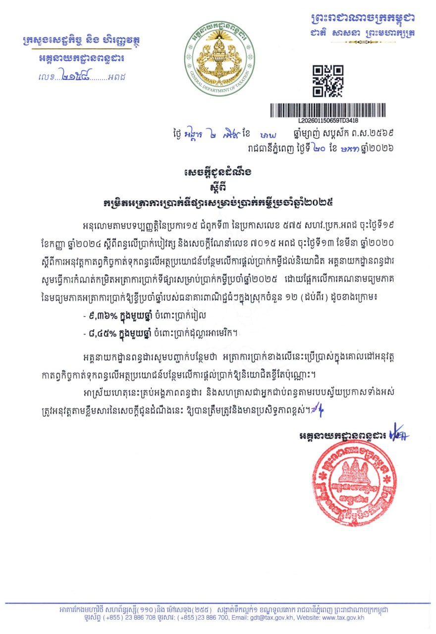 អគ្គនាយកដ្ឋានពន្ធដារនៃក្រសួងសេដ្ឋកិច្ច និងហិរញ្ញវត្ថុ បានចេញសេចក្តីជូនដំណឹង ស្តីពីកម្រិតអត្រាការប្រាក់ទីផ្សារ សម្រាប់ប្រាក់កម្ចីប្រចាំឆ្នាំ២០២៥។