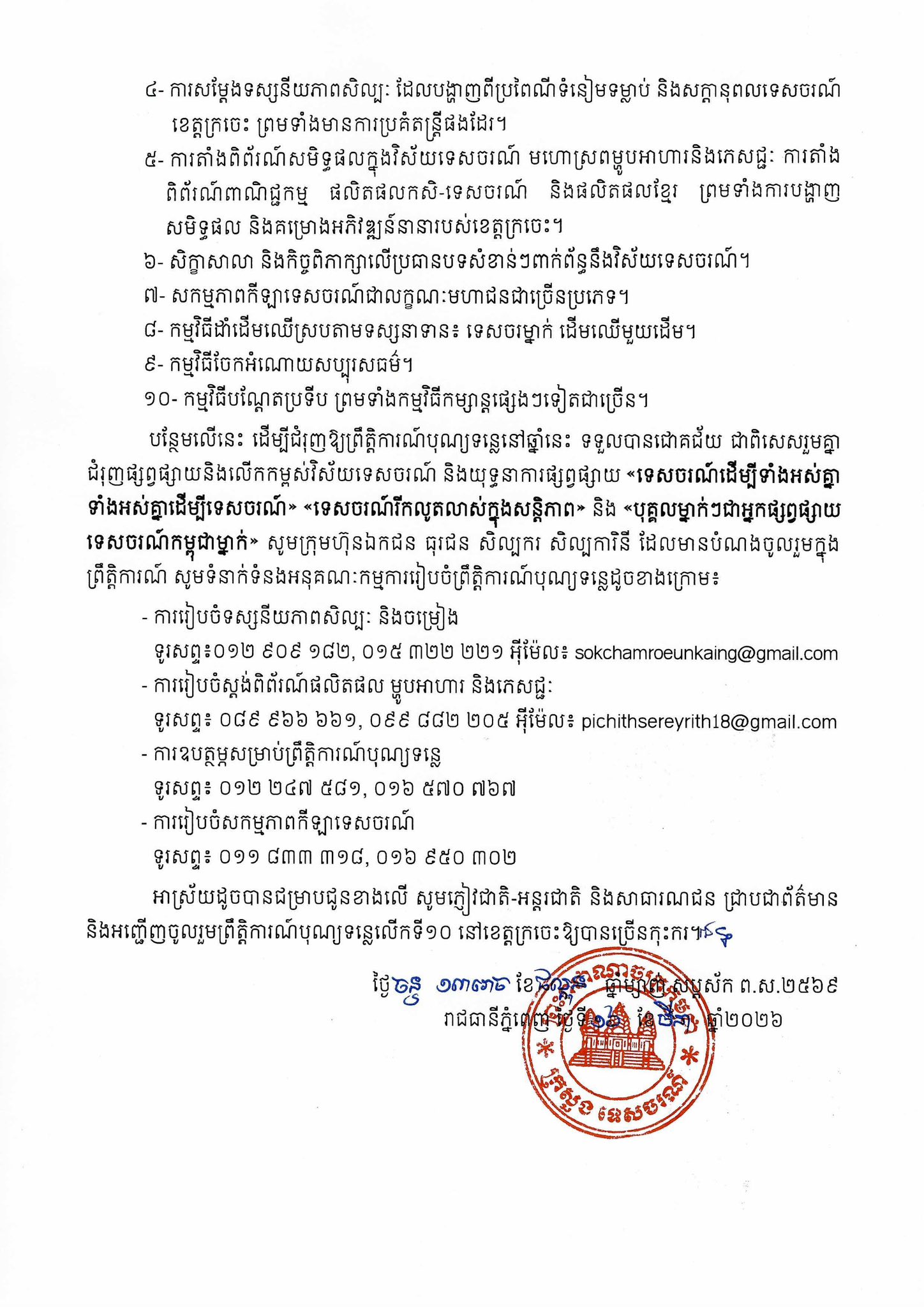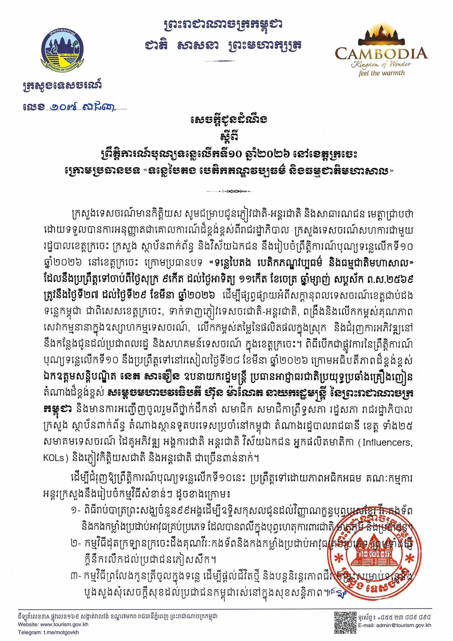 ក្នុងលិខិតបានបញ្ជាក់ថា ក្រសួងទេសចរណ៍សហការជាមួយ រដ្ឋបាលខេត្តក្រចេះ ក្រសួង ស្ថាប័នពាក់ព័ន្ធ និងវិស័យឯកជន នឹងពិធីបើកជាផ្លូវការនៃព្រឹត្តិការណ៍ បុណ្យទន្លេលើកទី១០ នឹងប្រព្រឹត្តទៅនៅរសៀលថ្ងៃទី២៨ ខែមីនា ឆ្នាំ២០២៦។ ដើម្បីជំរុញឲ្យព្រឹត្តិការណ៍បុណ្យទន្លេលើកទី១០នេះ ប្រព្រឹត្តទៅដោយភាពអធិកអធម គណៈកម្មការ អន្តរក្រសួងនឹងរៀបចំកម្មវិធីសំខាន់ៗ ដូចខាងក្រោម៖