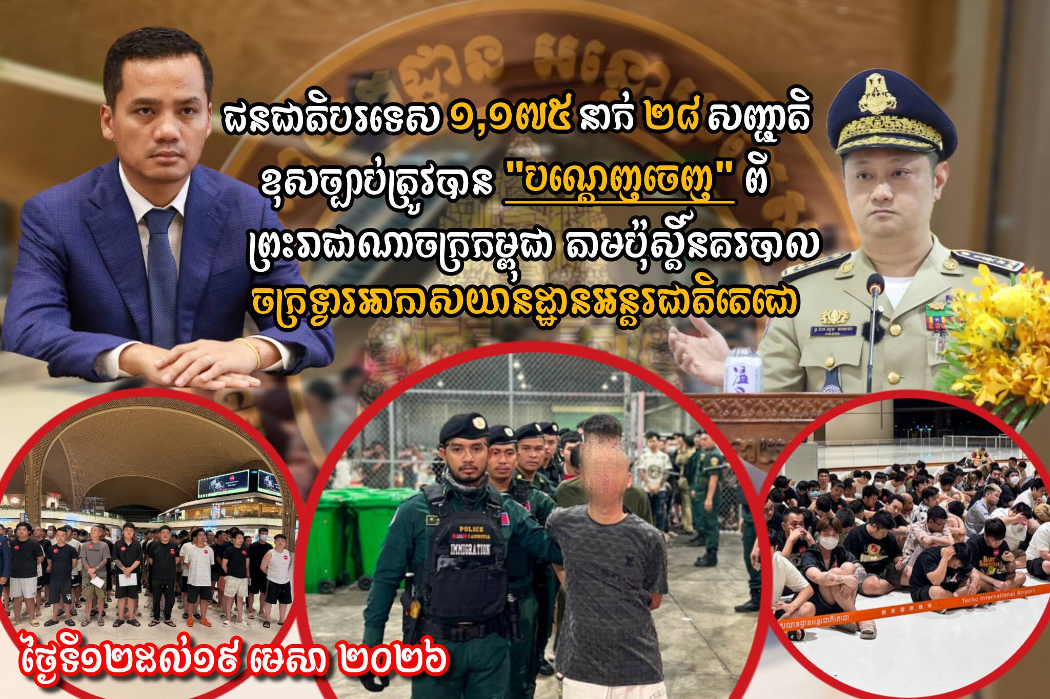 ចាប់ពីថ្ងៃទី១២ ដល់ទី១៩ ខែមេសា ឆ្នាំ២០២៦ អនុវត្តតាមអនុសាសន៍ដ៏ខ្ពង់ខ្ពស់ របស់ឯកឧត្តមអភិសន្តិបណ្ឌិត ឧបនាយករដ្ឋមន្ត្រី រដ្ឋមន្ត្រីក្រសួងមហាផ្ទៃ ឯកឧត្តម សន្តិបណ្ឌិត និងថ្នាក់ដឹកនាំក្រសួងមហាផ្ទៃ ឯកឧត្តម ឧត្តមសេនីយ៍ឯក សុខ វាសនា អគ្គនាយកអន្តោប្រវេសន៍ បានណែនាំឱ្យនាយកដ្ឋានស៊ើបអង្កេត និងអនុវត្តនីតិវិធី បន្តធ្វើកាបណ្ដេញចេញជនបរទេសសរុបចំនួន ១,១៧៥នាក់ ស្រី១៦៧នាក់ មាន ២៨សញ្ជាតិ រួមមាន ៖ រវ៉ាន់ដា កាមេរូន មីយ៉ាន់ម៉ា នេប៉ាល់ វៀតណាម ឥណ្ឌា ស្រីលង្កា ចិន ហ្ស៊ីមប៉ាវេ បង់ក្លាដេស នីហ្សេរីយ៉ា ឥណ្ឌូនេស៊ី សេរ៉ាឡេអូន យូហ្គង់ដា អូត្យូពី កេនយ៉ា ប៉ាគីស្ថាន ម៉ាកាដាស្តារ ហ្គាណា ហ្វីលីពីន លីបង់ កូរ៉េ ម៉ាឡេស៊ី អង់គ្លេស ប៉ូឡូញ ចិនតៃវ៉ាន់ កៀជីគីស្ថាន និងកាណាដា ត្រូវបានបណ្ដេញចេញពីព្រះរាជាណាចក្រកម្ពុជា។