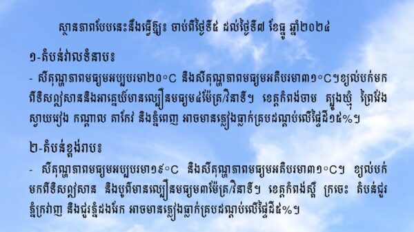 ព័ត៌មានជាតិ កម្ពុជា បន្តចុះត្រជាក់ពី១៩°C-២០°C ចាប់ពីថ្ងៃនេះ ដល់ថ្ងៃទី៧ ខែធ្នូ ឆ្នាំ២០២៤ ក្រសួងធនធានទឹក និងឧតុនិយ... សុផុនខែធ្នូ 5, 2024