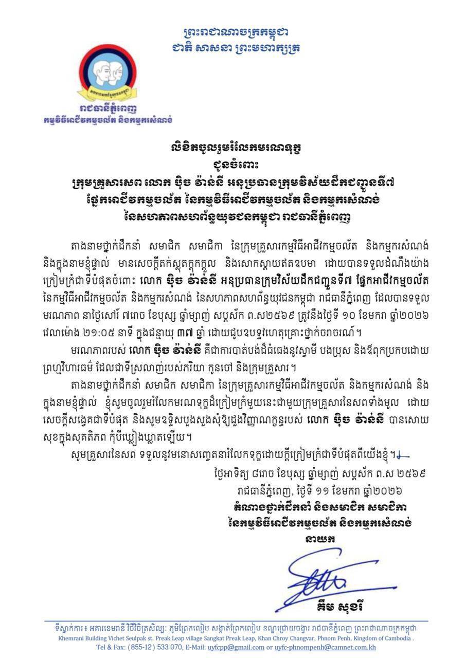 នាថ្ងៃទី១១ ខែ មករាឆ្នាំ២០២៦ ក្រុមការងារកម្មវិធីអាជីវកម្មចល័តនិងកម្មករសំណង់ចុះសួរ សុខទុក្ខ ដល់ក្រុមគ្រួសារ សពលោក បុិច វ៉ាន់នីអនុប្រធានក្រុមវិស័យដឹងជញ្ជូនទី៧ ផ្នែកអាជីវកម្មចល័ត នៃកម្មវិធីអាជីវកម្មចល័តនិងកម្មករសំណង់នៃស.ស.យ.ករាជធានីភ្នំពេញ ដែលលោកបានទទួលមរណៈភាព កាលពីយប់ ថ្ងៃទី១០ខែមករា ឆ្នាំ២០២៦។
